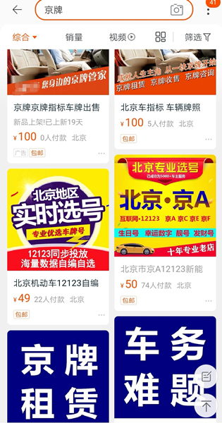 淘宝搜索关键词 跳出上百条“京牌租赁”信息