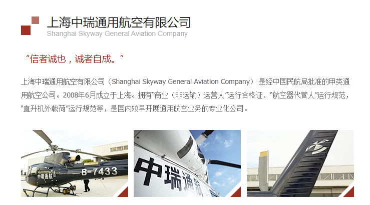 涉事企业官网信息显示,上海中瑞通用航空有限公司是经中国民航局批准的甲类通用航空公司,2008年6月成立于上海,拥有“商业(非运输)运营人”运行合格证、“航空器代管人”运行规范,“直升机外载荷”运行规范等,是国内较早开展通用航空业务的专业化公司。中瑞通航以直升机为主要机型,重点聚焦直升机电力、航空器代管、航空探矿、直升机航拍等市场领域。