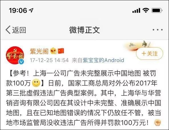 不过,被罚款100万元的上海华与华营销咨询有限公司,是因广告中使用的中华人民共和国地图未将国界线完整、准确的表示,损害了国家尊严及利益,当事人在以后的相关广告设计中,在已知其广告地图绘制错误的情况下,仍未将我国领土表示完整、准确,客观上持续了违法行为,放任了危害后果的继续发生,违反了《广告法》第九条规定。因此,2017年11月,上海市静安区市场监管局作出行政处罚,没收广告费用8.8万元,罚款100万元。