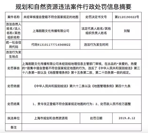 据上海市规划和自然资源局官网显示,上海剧酷文化传播有限公司未经测绘地理信息主管部门审核,在出品的电视剧《亲爱的,热爱的》中擅自登载不符合国家规定地图的行为,被责令改正并罚款人民币十万元整,处罚日期为2019年8月12日。