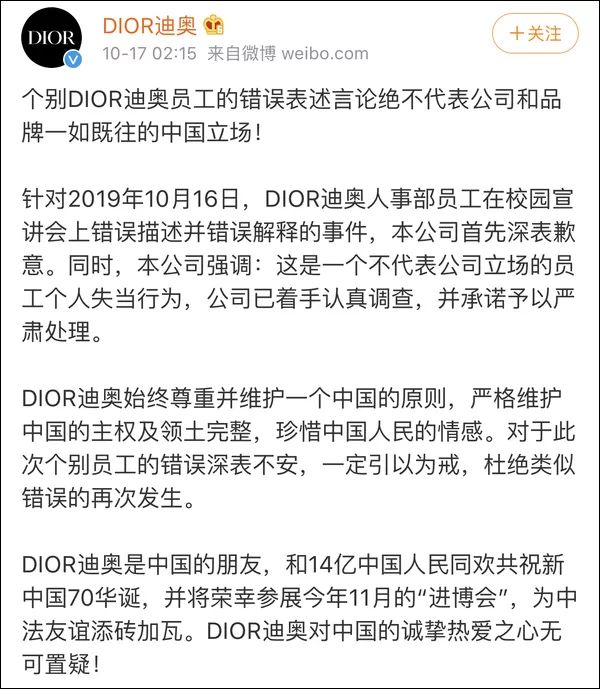 10月17日凌晨,迪奥因此事紧急道歉,称对中国有着“诚挚热爱之情”。10月19日晚上8点30分,迪奥2020春夏成衣系列发布秀上海场如期举行。现场背景音乐,放起了《我和我的祖国》。