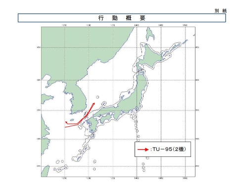 22日日本防卫省统合幕僚监部也发布了俄罗斯轰炸机此次巡航任务的相关信息。日本防卫省称,当天发现两架俄罗斯图-95轰炸机在日本海、东海上空飞行,日本航空自卫队的战斗机紧急出动进行监视应对,并发布了俄罗斯轰炸机的飞行路线。