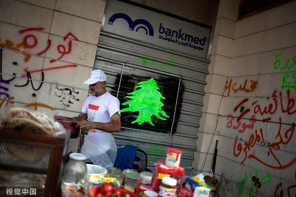 当地时间2019年10月25日,黎巴嫩贝鲁特,当地示威抗议持续,多家银行歇业。从当地时间10月17日起,黎巴嫩多地爆发大规模民众示威。示威者对该国落后的基础设施、崩溃的经济和政府实施的紧缩政策感到不满,要求对黎巴嫩的政治体系进行全面改革。据路透社报道,参与抗议的群众达数万人,黎巴嫩官员称此次抗议规模为十年来最大。