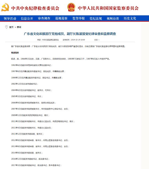 中国网10月29日讯 据中央纪委国家监委网站消息,广东省文化和旅游厅党组成员、副厅长陈波涉嫌严重违纪违法,目前正接受广东省纪委监委纪律审查和监察调查。