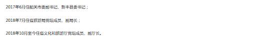 2018年10月至今任省文化和旅游厅党组成员、副厅长。