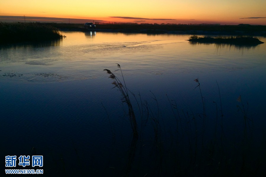 11月5日,一辆汽车从大庆市郊的一个湖泊旁驶过。初冬时节,黑龙江多地尚未冰封雪飘,江湖湿地笼罩在暮色暖光之中宛若春华。新华网 杜文杰摄
