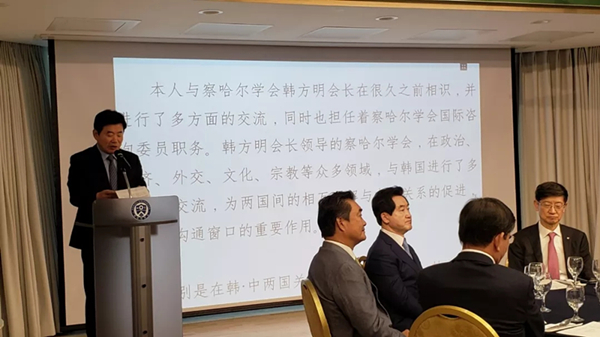 韩国前副总理金振杓议员在致辞中表示,察哈尔学会作为中国最好的非官方外交与国际关系智库之一,在政治、外交、经济、文化、宗教等多个领域与韩国进行过许多交流,在两国相互理解和增进友谊方面起到了重要沟通窗口的作用。此次同韩国具有代表性的私立学府也是世界著名的大学延世大学携手共建韩中公共外交的中心即延世-察哈尔中心,意义重大,必将为半岛和平繁荣以及韩中两国的经济合作与友好关系的发展发挥重要的作用。金振杓指出,在两国关系困难的时期,察哈尔学会为了中韩友好发展,竭尽全力,推动了韩中两国的关系逐步转圜。韩国各界高度评价韩方明带领的察哈尔学会所做的贡献,因此文在寅总统于去年初授予韩方明“大韩民国外交贡献兴仁章”。在包括半岛和平在内的地区安全方面,韩中合作不可或缺,政府之间紧密的外交合作十分重要,但更需要两国之间的公共外交。