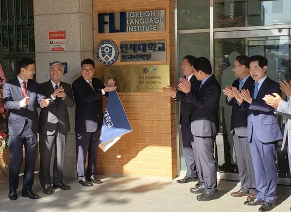 察哈尔学会会长韩方明(左三)、中国驻韩国大使邱国洪(左二)、韩国前副总理金振杓议员(右三)与其他嘉宾共同为延世-察哈尔中心揭牌。