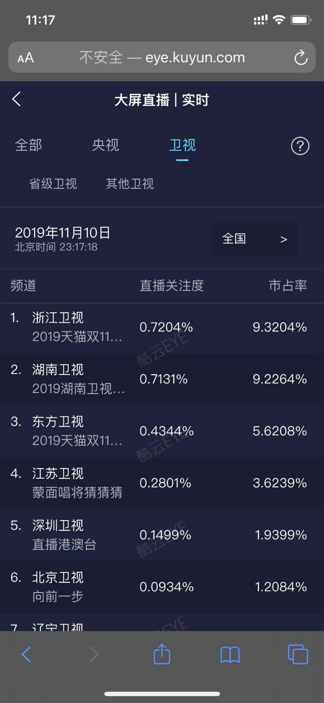 据第三方收视率监测公司酷云的实时数据,2019天猫双11狂欢夜在浙江卫视、东方卫视两大平台的直播市占率达到近15%,强势领跑全国同时段节目,其中浙江卫视以9.3204%稳居榜首。
