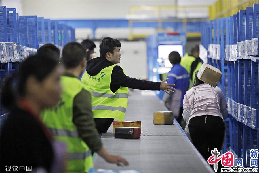 2019年11月11日,快递企业位于苏州浒关的分拨中心,操作车间内,工人们正在流水线上忙碌着。(图片来源:视觉中国)