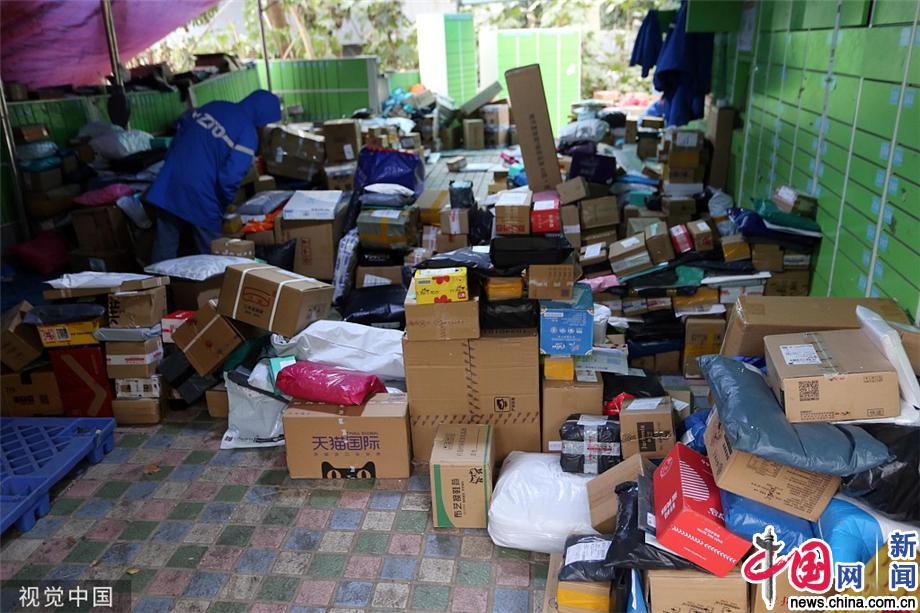 2019年11月12日,在南京师范大学、南京大学等各高校的快递点,“双十一”后的快递量激增,“快递山”模式开启,快递点堆满了大小的各种快递。雨田/视觉中国