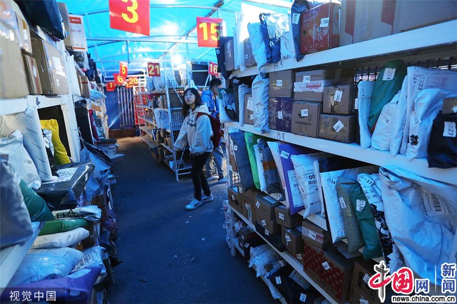 2019年11月12日,在南京师范大学、南京大学等各高校的快递点,“双十一”后的快递量激增,“快递山”模式开启,快递点堆满了大小的各种快递。雨田/视觉中国