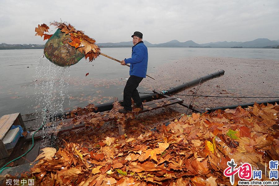 2019年11月18日,随着北方强冷空气影响,杭州气温持续下降。一夜北风让北山街梧桐树叶纷纷落下,给西湖增添了浓浓秋色。林云龙/视觉中国