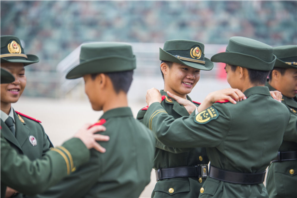 仪式上,新兵团领导宣读了授衔命令,勉励新兵们认清军人身份,牢记军人职责,苦练军事技能,走好军旅生涯的每一步。随后,新兵团领导为新兵代表佩戴了警衔。台下的新兵们满怀激动与喜悦,互相佩戴上鲜红的肩章,享受着军旅生涯的第一份荣光。