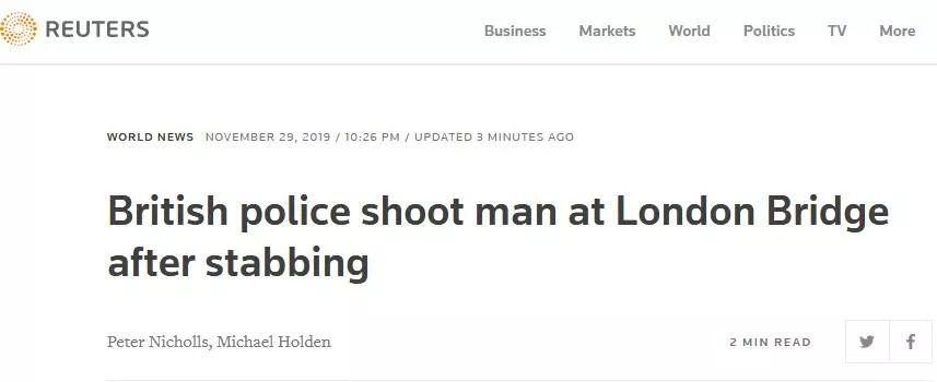 一名安全部门消息人士则告诉路透社,据信有人当天在伦敦桥被刺伤,一名嫌疑人被警方开枪击中。天空新闻报道说,至少有一名不是袭击者的人在此事件中死亡。