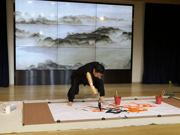 韩国残疾人画家石敞宇与中国书法家叶欣在庆祝活动现场共同创作书画作品《新时代新征程》。(首尔中国文化中心供图)