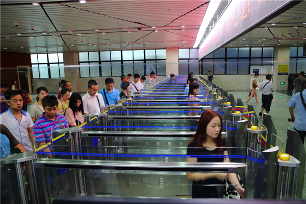 2014年5月25日,首位持用电子往来港澳通行证的旅客经拱北口岸出境,查验仅用时8秒。珠海边检总站拱北边检站供图
