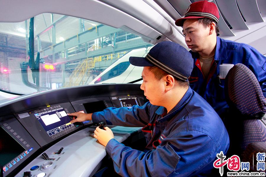 沈阳局集团公司职工精心检修动车组列车。 (中国网发 高飞 摄 )