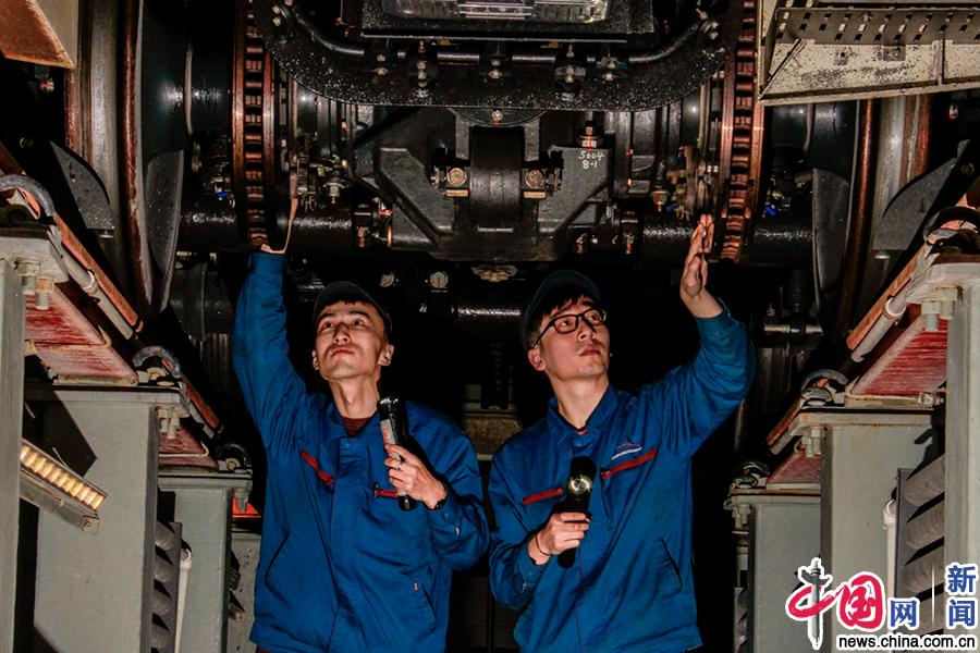 沈阳局集团公司职工精心检修动车组列车。(中国网发 高飞 摄)