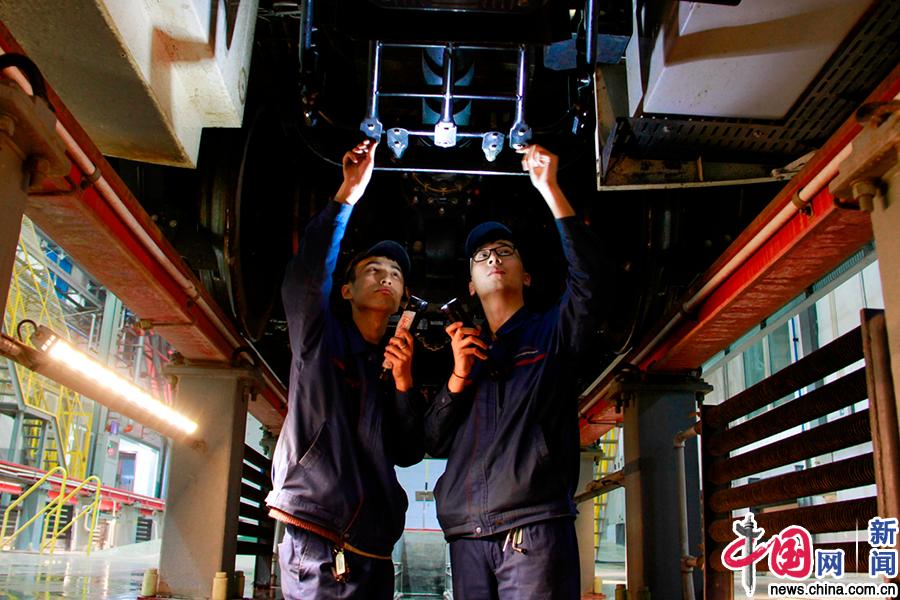 沈阳局集团公司职工精心检修动车组列车。(中国网发 高飞 摄)