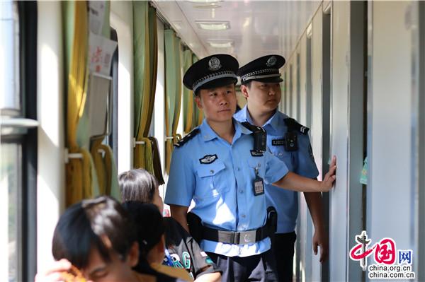 包头铁路公安处民警在旅客列车车厢巡查。