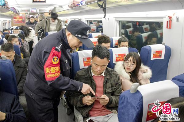 图为郑州铁路公安处乘警在列车上向旅客介绍安全常识。