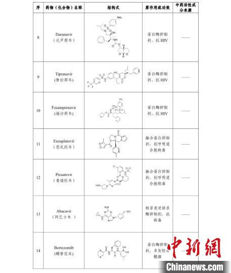 候选药物包括蛋白酶抑制剂茚地那韦(Indinavir)、沙奎那韦(Saquinavir)、洛匹那韦(Lopinavir)、卡非佐米(Carfilzomib)、利托那韦(ritonavir)等12种抗HIV药物,2种抗呼吸道合胞病毒药物,1种抗人巨噬病毒药物,1种抗精神分裂症药物,1种免疫抑制剂以及2种其他类药物;研究发现含有“二苯乙烯”结构的孟鲁司特以及植物药活性成分虎杖苷和脱氧土大黄苷与Mpro结合较好,可能对病毒有抑制作用;在前期抗SARS研究及计算机模拟基础上发现老药肉桂硫胺、环孢菌素A可能对2019-nCoV有效,其中肉桂硫胺是上世纪70年代用于抗精神分裂症的药物,对冠状病毒3CL水解酶具有抑制作用,免疫抑制剂环孢菌素A可以阻止病毒的核衣壳蛋白与人的环孢亲和素A相互结合,已有研究表明联用干扰素和环孢菌素A能显著抑制冠状病毒在人类支气管和肺部复制及造成的组织损伤。研究还发现,虎杖、山豆根等中药材中可能含有抗2019-nCoV有效成分。
