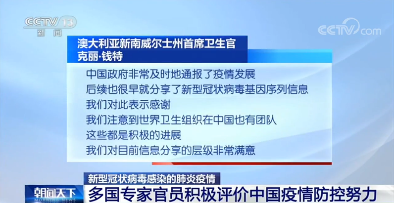 澳大利亚新南威尔士州首席卫生官克丽·钱特27日在当地卫生部门新闻发布会上说:中国政府非常及时地通报了疫情发展,后续也很早就分享了新型冠状病毒基因序列信息,我们对此表示感谢。我们注意到,世界卫生组织在中国也有团队,这些都是积极的进展,我们对目前信息分享的层级非常满意。