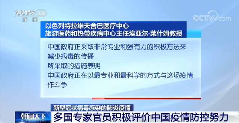 以色列特拉维夫舍巴医疗中心旅游医药和热带疾病中心主任埃亚尔·莱什姆教授认为:中国政府正采取“非常专业和强有力的积极方法”来减少病毒的传播。所采取的措施表明,中国政府正在以“最专业和最科学的方式”与这场疫情作斗争。