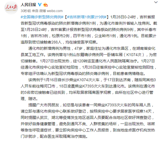通化市的新增病例为男性,47岁,家庭住址为通化市东昌区,在湖南省安化县某工地工作。该病例曾与1例山东籍确诊病例同一卧铺车厢(K1074次),为密切接触者。1月27日出现发热,经120转运至通化市人民医院隔离治疗。1月27日经通化市疾控中心实验室初检阳性,1月28日经省疾控中心实验室复核检测阳性,专家组评估确认为新型冠状病毒感染的肺炎确诊病例,目前患者病情稳定。