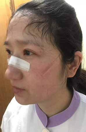 完成紧张的护理工作后,值班护士还要经常对仪表、病床等进行消毒。一个班次下来,每名护士基本上全身都会被汗水浸湿,脸上的防护罩勒痕更是清晰可见。