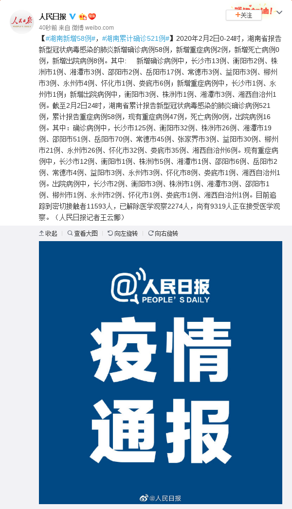 2020年2月2日0-24时,湖南省报告新型冠状病毒感染的肺炎新增确诊病例58例,新增重症病例2例,新增死亡病例0例,新增出院病例8例。其中: 新增确诊病例中,长沙市13例、衡阳市2例、株洲市1例、湘潭市3例、邵阳市2例、岳阳市17例、常德市3例、益阳市3例、郴州市3例、永州市4例、怀化市1例、娄底市6例;新增重症病例中,长沙市1例、永州市1例;新增出院病例中,衡阳市3例、株洲市1例、湘潭市3例、湘西自治州1例。截至2月2日24时,湖南省累计报告新型冠状病毒感染的肺炎确诊病例521例,累计报告重症病例58例,现有重症病例47例,死亡病例0例,出院病例16例。其中:确诊病例中,长沙市125例、衡阳市32例、株洲市26例、湘潭市19例、邵阳市51例、岳阳市70例、常德市45例、张家界市3例、益阳市30例、郴州市21例、永州市26例、怀化市32例、娄底市35例、湘西自治州6例。现有重症病例中,长沙市12例、衡阳市1例、株洲市5例、湘潭市1例、邵阳市6例、岳阳市2例、常德市4例、益阳市3例、永州市3例、怀化市8例、娄底市1例、湘西自治州1例。出院病例中,长沙市2例、衡阳市3例、株洲市1例、湘潭市3例、邵阳市1例、郴州市1例、永州市2例、怀化市1例、娄底市1例、湘西自治州1例。目前追踪到密切接触者11593人,已解除医学观察2274人,尚有9319人正在接受医学观察。(人民日报记者王云娜)