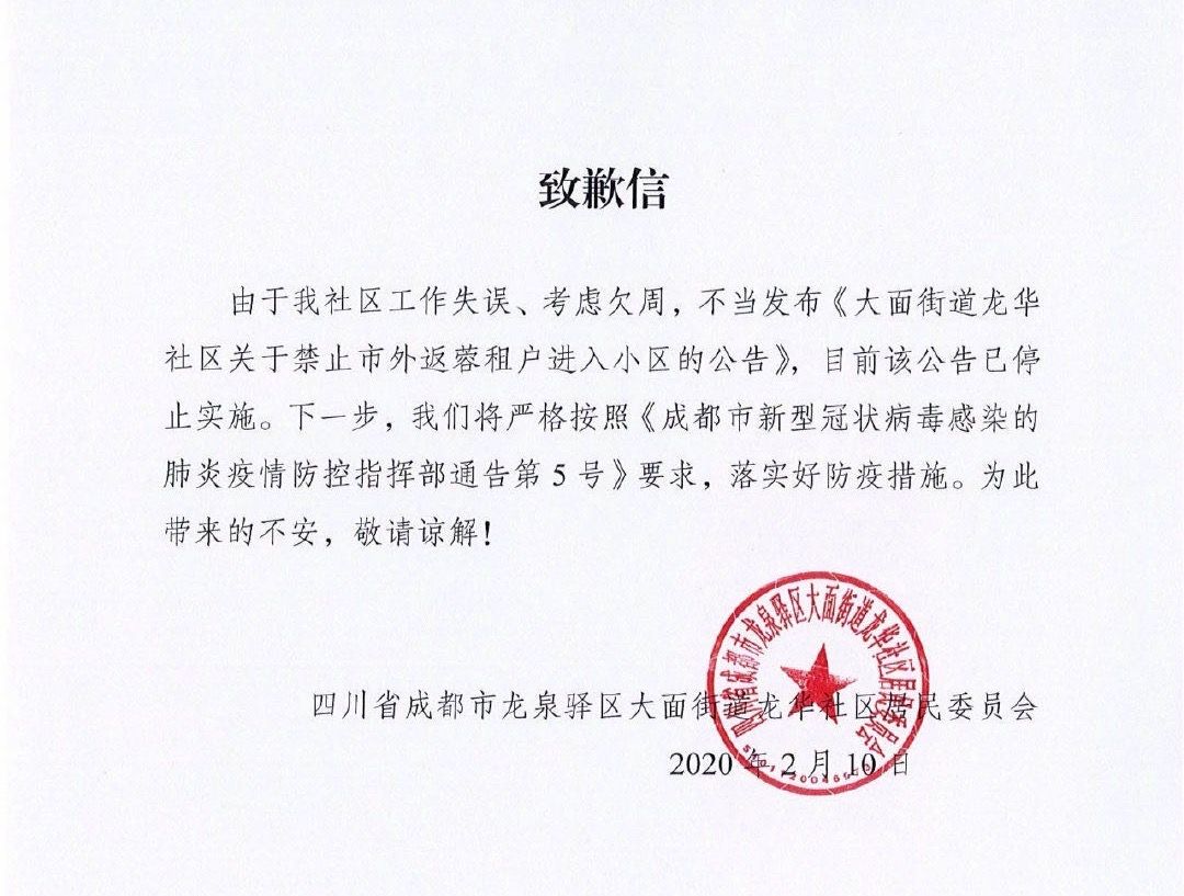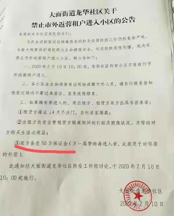 今日(2月10日),四川成都一社区发布“禁止市外返蓉租户进入小区”的公告,其中规定,租赁方与租户各交50万元保证金,“万一属病毒携带者,此款用于对邻居的补偿。”下午,社区方面回应新京报记者称,此举确实不妥,已撤下公告,并已发布致歉信。