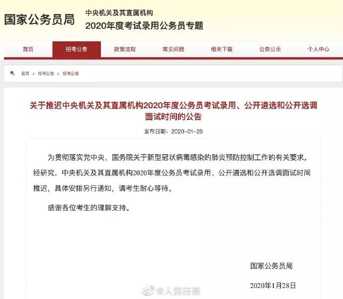 国家公务员局发布公告称,中央机关及其直属机构2020年度公务员考试录用、公开遴选和公开选调面试时间推迟,具体安排另行通知,请考生耐心等待。