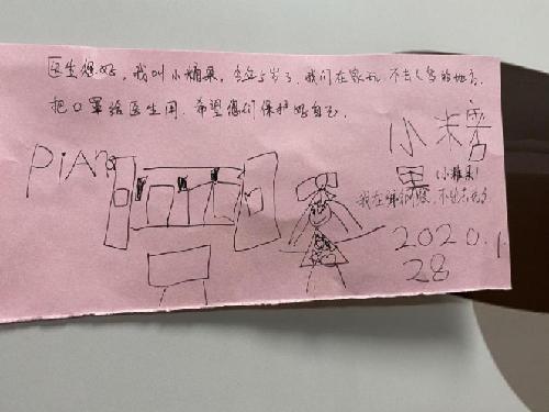 贴在急诊科办公室门上的5岁小女孩的承诺:我们在家玩,把口罩留给医生用。张赫 摄
