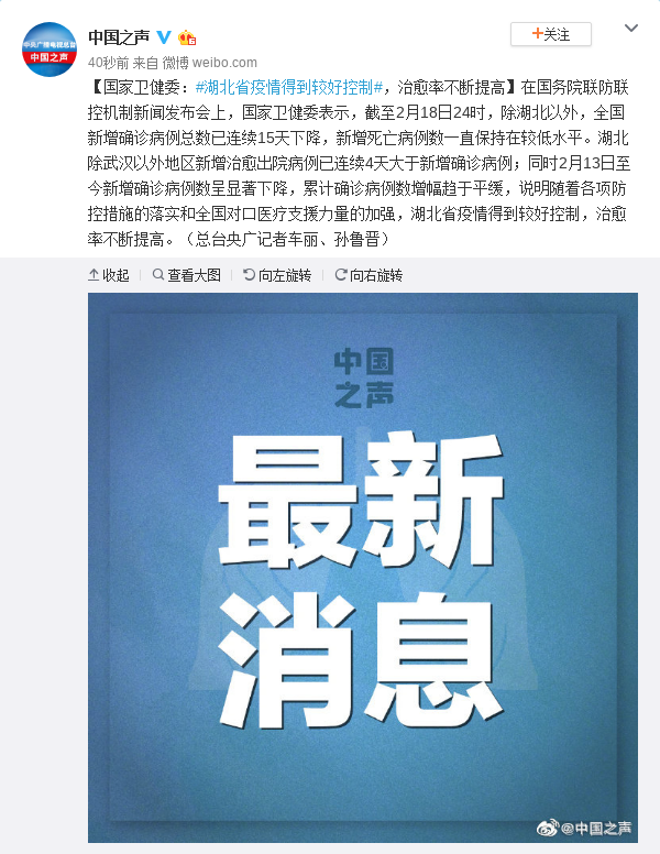 在国务院联防联控机制新闻发布会上,国家卫健委表示,截至2月18日24时,除湖北以外,全国新增确诊病例总数已连续15天下降,新增死亡病例数一直保持在较低水平。湖北除武汉以外地区新增治愈出院病例已连续4天大于新增确诊病例;同时2月13日至今新增确诊病例数呈显著下降,累计确诊病例数增幅趋于平缓,说明随着各项防控措施的落实和全国对口医疗支援力量的加强,湖北省疫情得到较好控制,治愈率不断提高。(总台央广记者车丽、孙鲁晋)