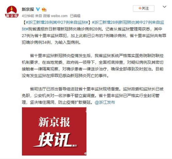 浙江新增28例新冠肺炎其中27例来自监狱我省通报昨日新增新冠肺炎确诊病例28例。记者从省监狱管理局获悉,其中27例为省十里丰监狱罪犯,加上此前已公布的7例确诊病例,省十里丰监狱共有罪犯确诊病例34例,为输入型病例。