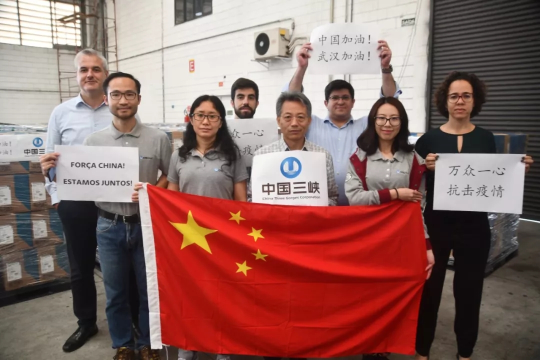 △ 中国三峡(巴西)有限公司的中外员工站在捐赠的物资前为中国抗击疫情加油。
