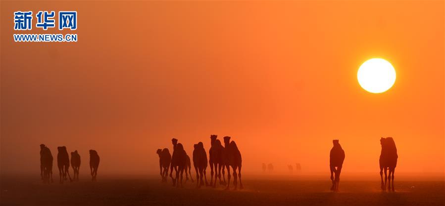 2月22日,在科威特杰赫拉省的沙漠,骆驼在晨曦中行走。新华社发(阿萨德摄)