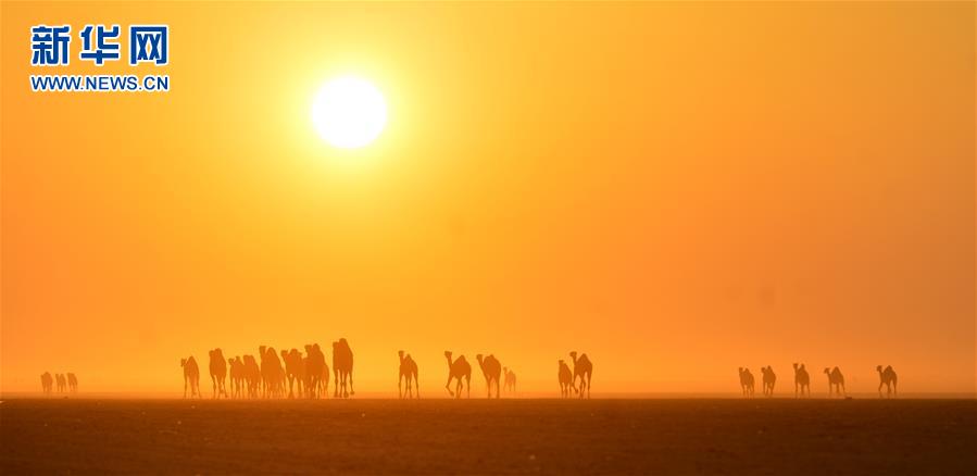 2月22日,在科威特杰赫拉省的沙漠,骆驼在晨曦中行走。新华社发(阿萨德摄)