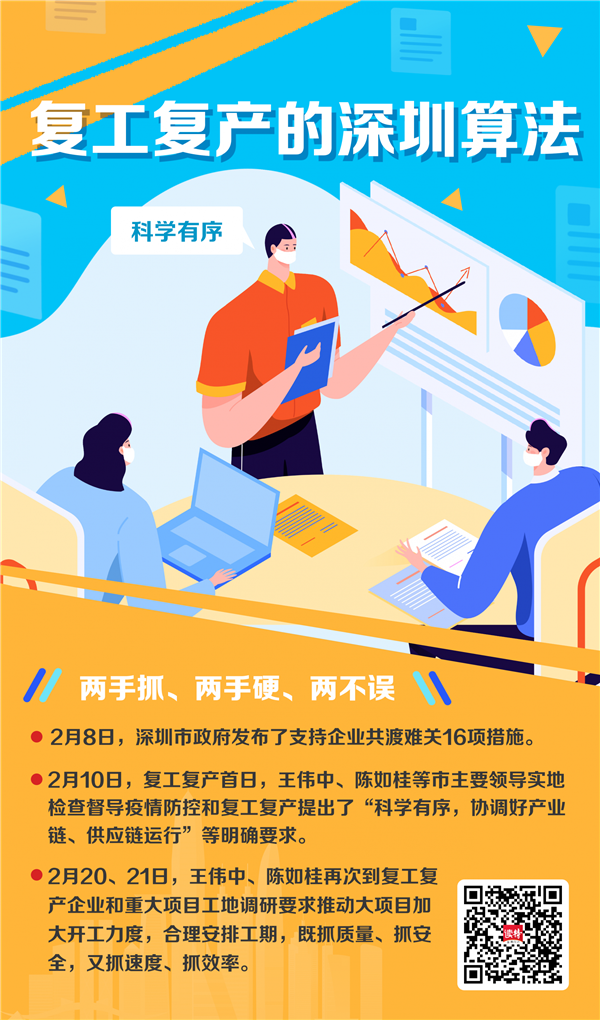 2月中旬以来,市委市政府更是连续召开5次会议部署复工复产。从“科学有序指导帮助企业复工复产”到“制定相关的复工指引、‘一企一策’指导督促企业细化复工复产方案”,再到“分区分级精准防控,全力服务和推进各类企业有序复工复产,坚决不搞‘一刀切’、‘简单化’,全力加强经济运行分析调度,狠抓经济领域重大工作落实”,深圳“战疫情、稳经济”的信心坚定。