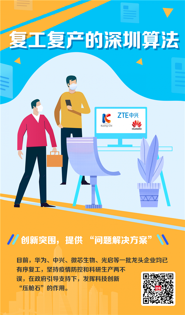 科技企业是深圳的创新主体。目前,华为、中兴、微芯生物、光启等一批龙头企业均已有序复工,坚持疫情防控和科研生产两不误,在政府引导支持下,发挥科技创新“压舱石”的作用。