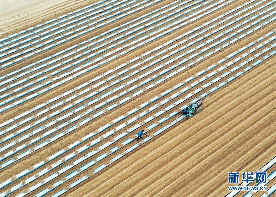 2月24日,山东省胶州市胶西街道苑戈庄村农民为种植的马铃薯覆盖地膜(无人机照片)。 初春时节,气温回升,各地农民在田间地头忙于农业生产。 新华社发(王昭脉 摄)