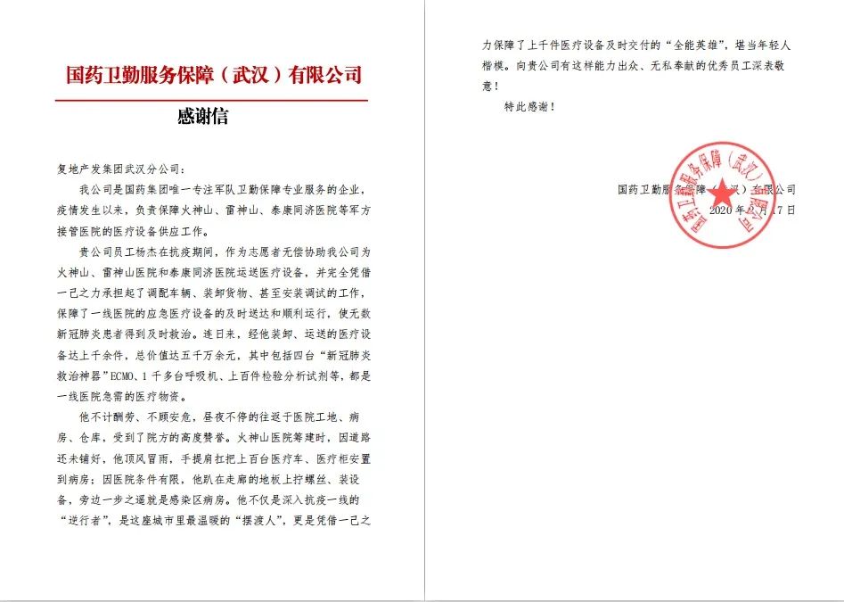 △国药卫勤公司写给杨杰的感谢信
