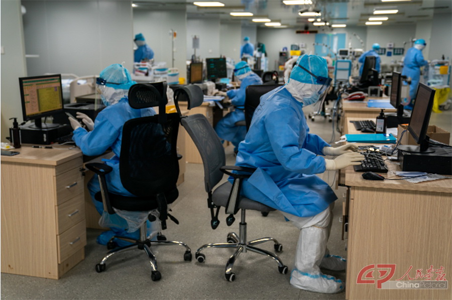 火神山医院感染一科一病区重症监护室,医护人员正在电脑中管理患者的各种体征数据,根据这些数据制定不同的治疗方案。