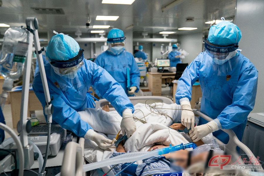 感染一科一病区重症监护室,重症医学一科张西京主任(右一)与同事一起为患者的体征做检查。