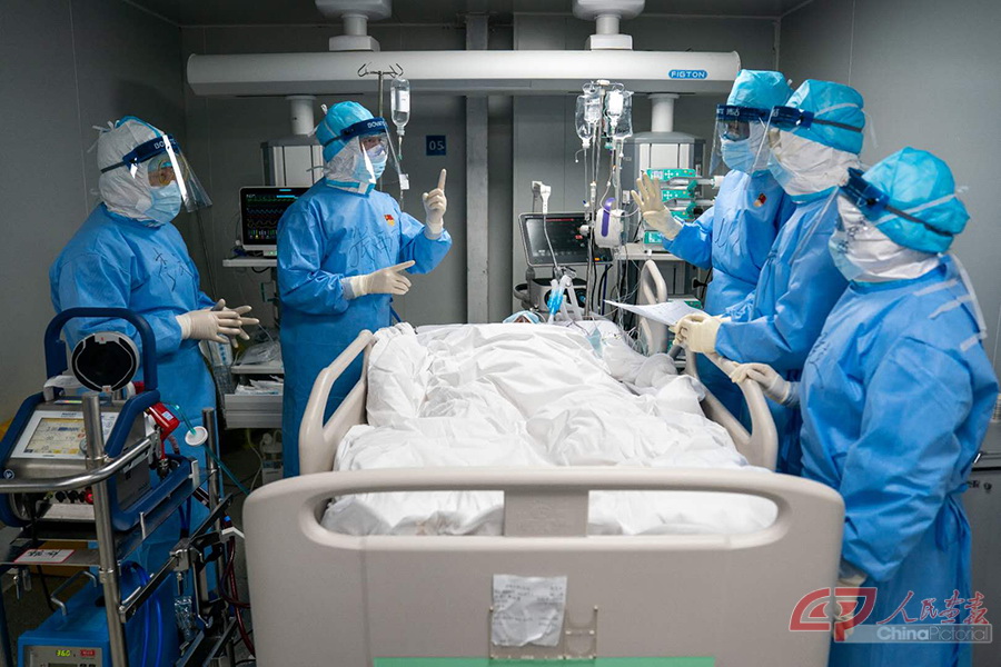 感染一科一病区重症监护室,重症医学一科张西京主任(左二)与同事一同为患者制定治疗方案。