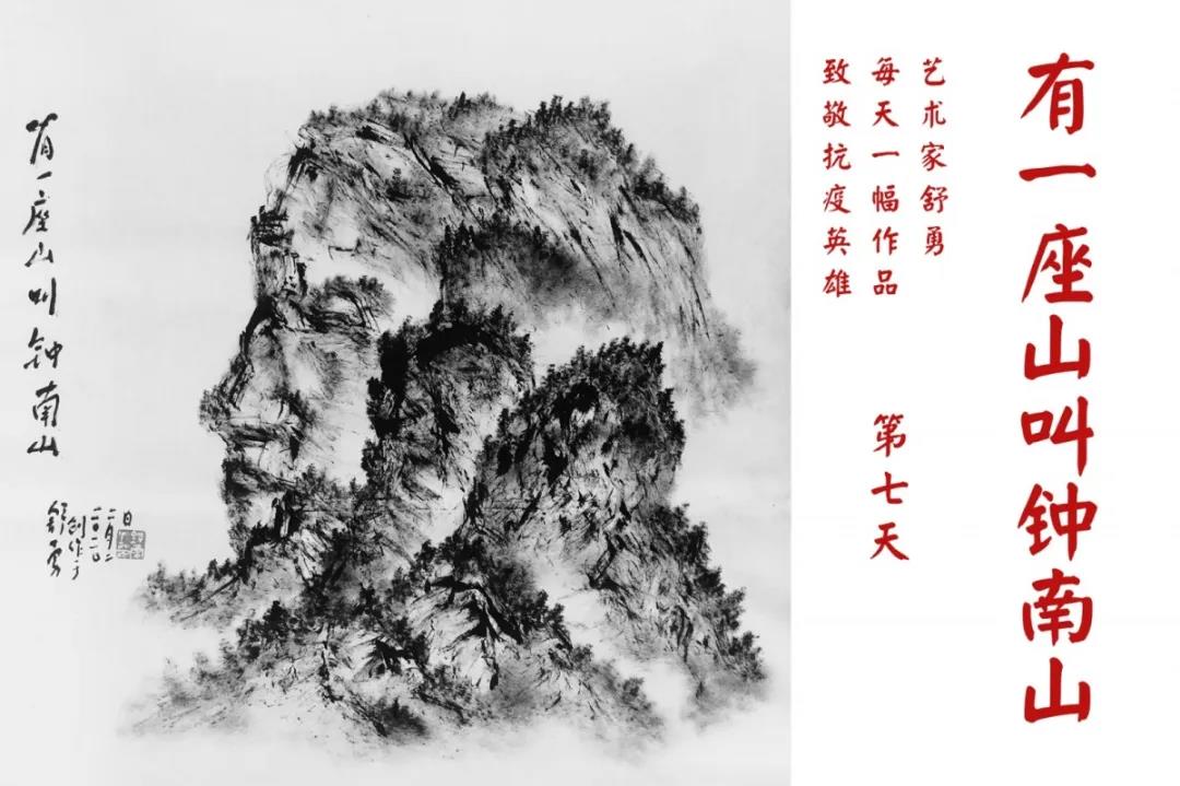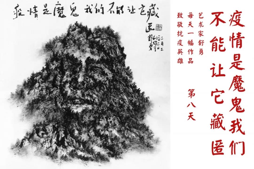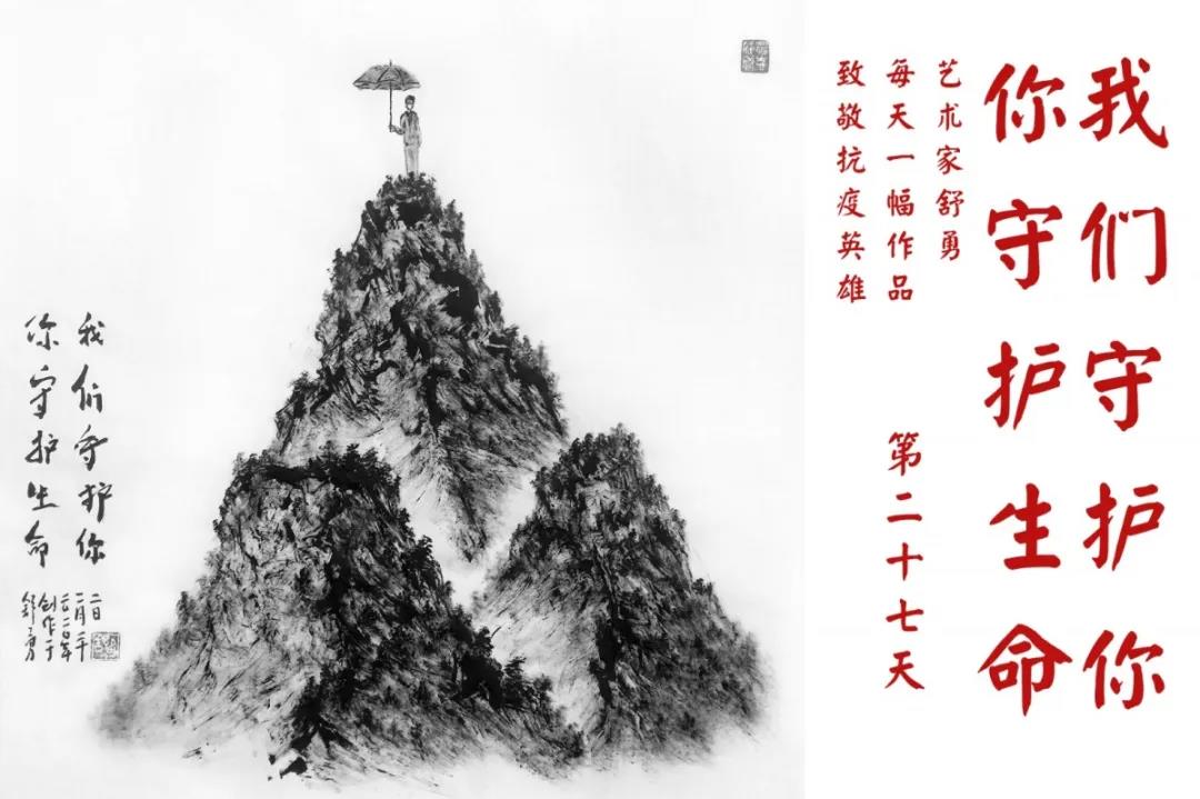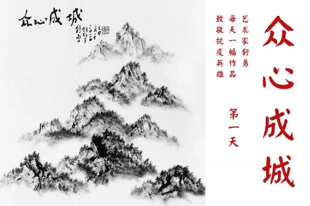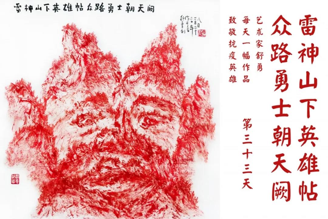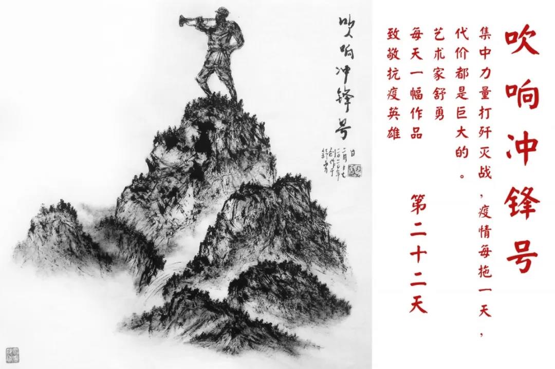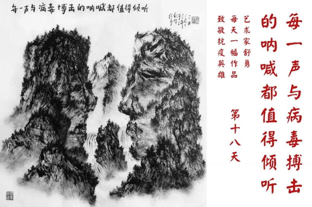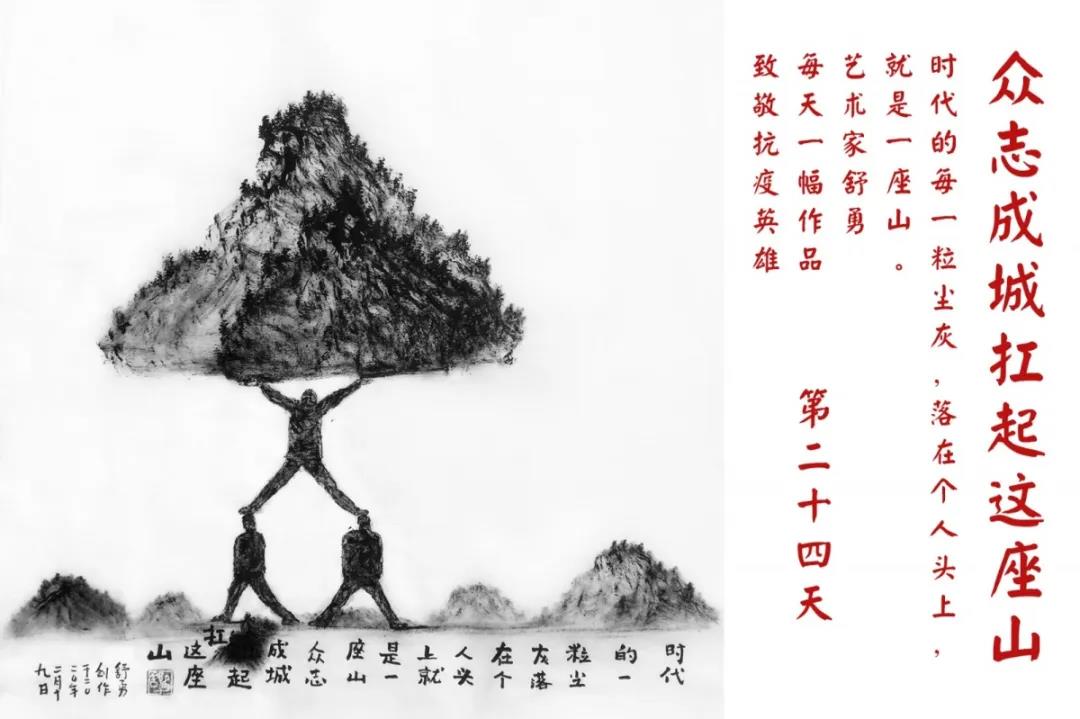 群山,握紧着拳头在呐喊;峻岭,变成了一条腾飞的巨龙;巨峰,托起了一个吹号的先锋;碧嶂,合拢出一朵铿锵的英雄之花……随着疫情的进展,艺术家舒勇始终以山为题材,每天创作一幅不同主题的作品向战斗在医疗战线的英雄们致敬,迄今已创作了43幅。北京南站还将他创作的这批“致敬抗疫英雄”作品做成公益广告,在上百个动态屏幕滚动播放。据称,他的致敬行动要持续到疫情结束,并最终将作品全部捐赠出去。他说:这个行动与战斗在第一线的医护人员相比,显得单薄与微不足道。但是从自己的角度来审视,在这种微不足道的坚持中,让我找到了一个文艺工作者的历史使命与担当。