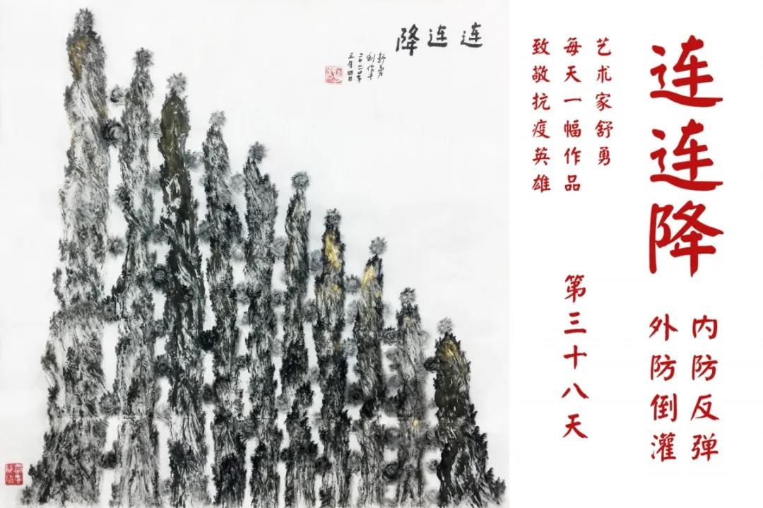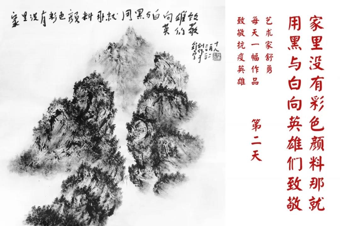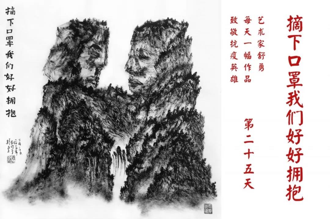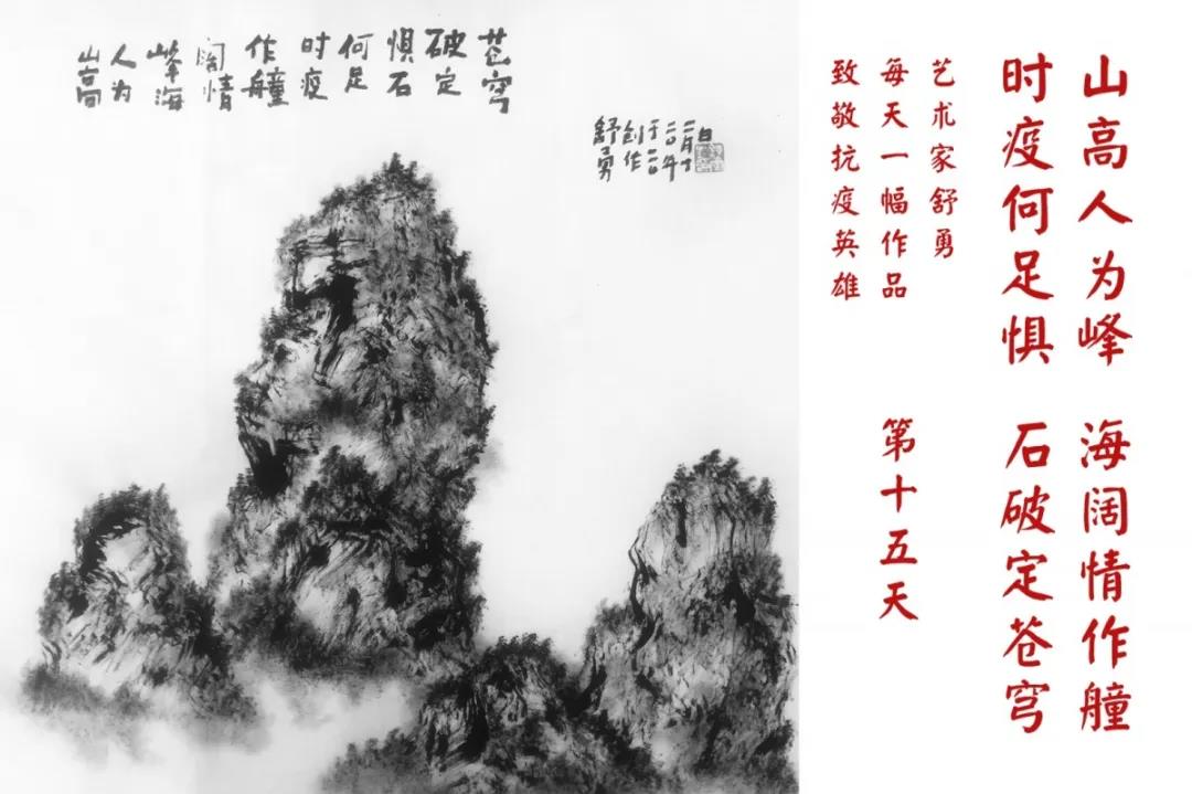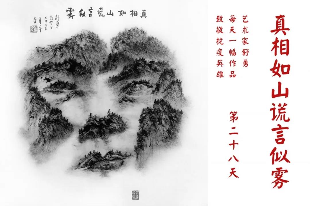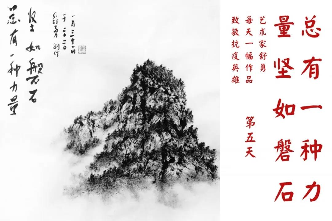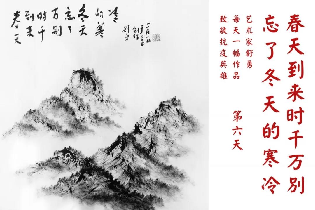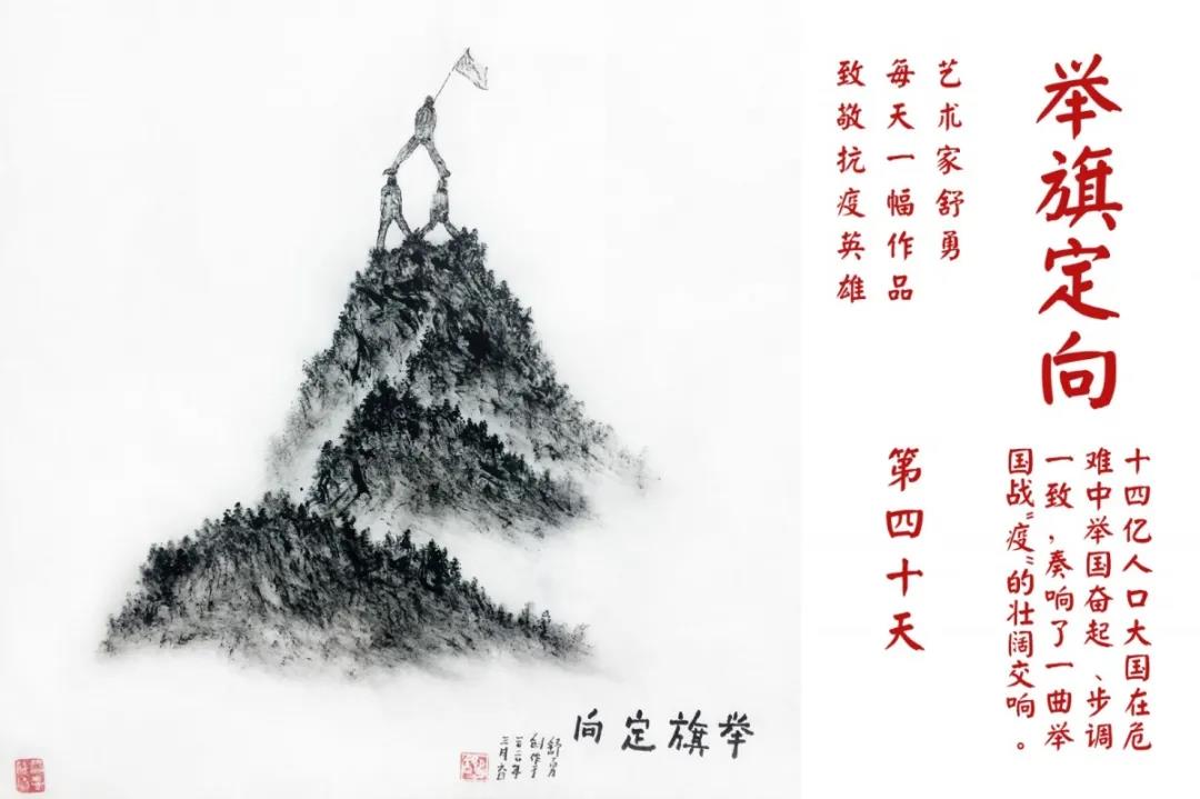 群山,握紧着拳头在呐喊;峻岭,变成了一条腾飞的巨龙;巨峰,托起了一个吹号的先锋;碧嶂,合拢出一朵铿锵的英雄之花……随着疫情的进展,艺术家舒勇始终以山为题材,每天创作一幅不同主题的作品向战斗在医疗战线的英雄们致敬,迄今已创作了43幅。北京南站还将他创作的这批“致敬抗疫英雄”作品做成公益广告,在上百个动态屏幕滚动播放。据称,他的致敬行动要持续到疫情结束,并最终将作品全部捐赠出去。他说:这个行动与战斗在第一线的医护人员相比,显得单薄与微不足道。但是从自己的角度来审视,在这种微不足道的坚持中,让我找到了一个文艺工作者的历史使命与担当。