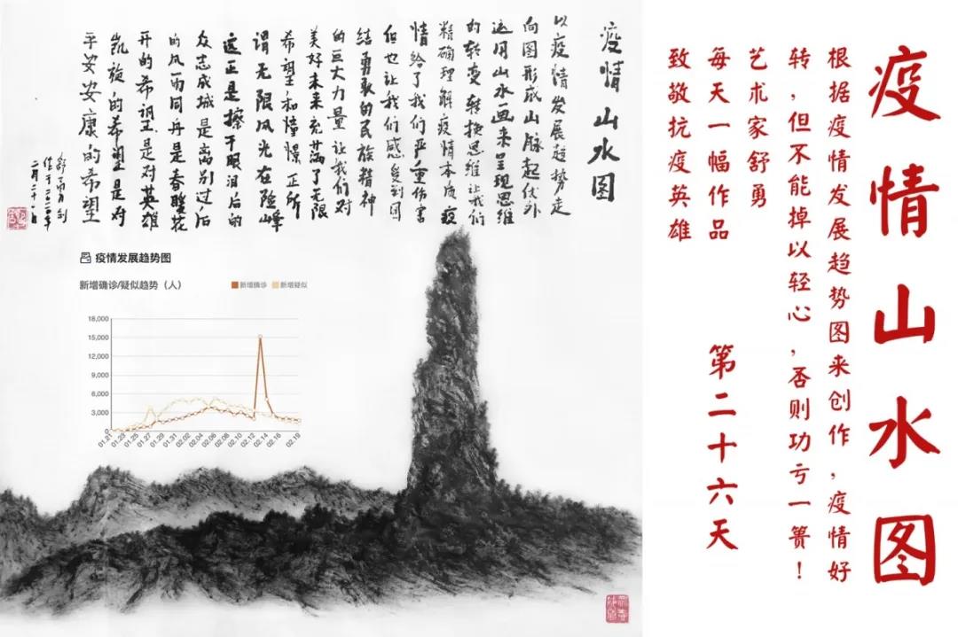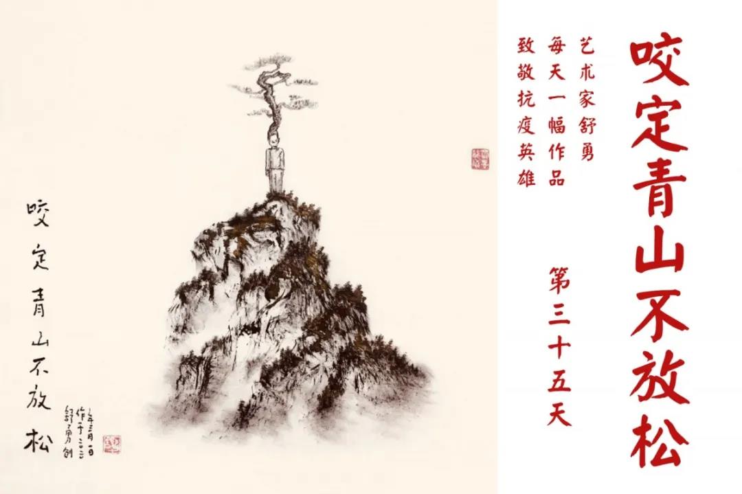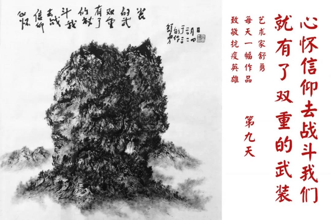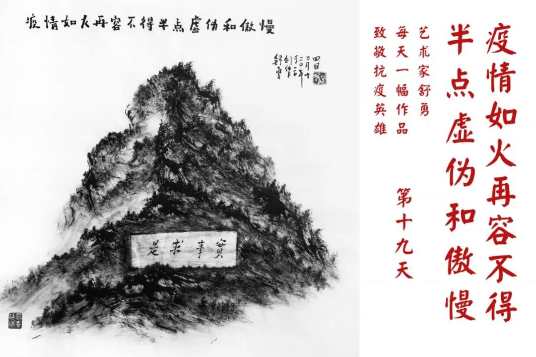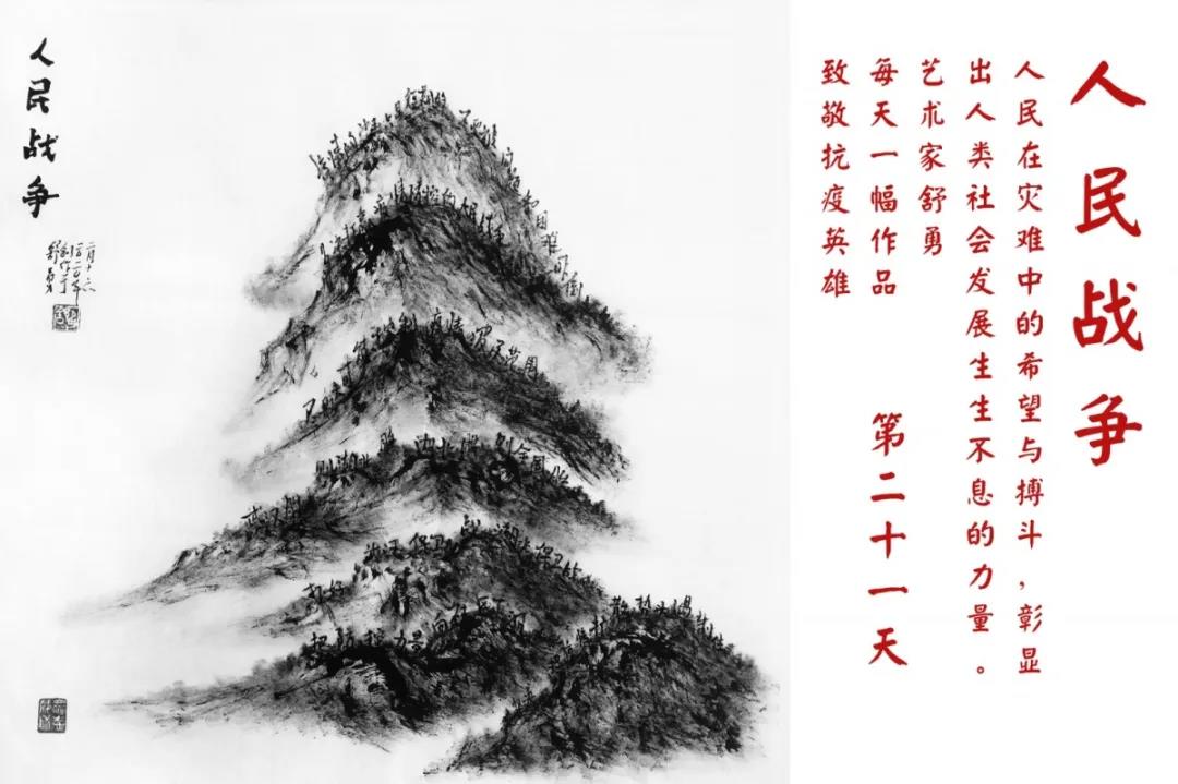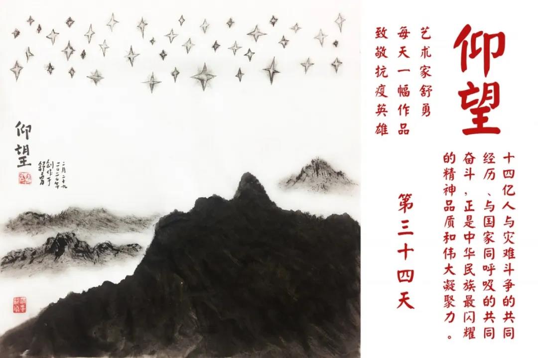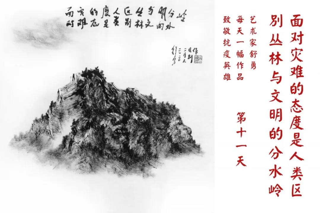 群山,握紧着拳头在呐喊;峻岭,变成了一条腾飞的巨龙;巨峰,托起了一个吹号的先锋;碧嶂,合拢出一朵铿锵的英雄之花……随着疫情的进展,艺术家舒勇始终以山为题材,每天创作一幅不同主题的作品向战斗在医疗战线的英雄们致敬,迄今已创作了43幅。北京南站还将他创作的这批“致敬抗疫英雄”作品做成公益广告,在上百个动态屏幕滚动播放。据称,他的致敬行动要持续到疫情结束,并最终将作品全部捐赠出去。他说:这个行动与战斗在第一线的医护人员相比,显得单薄与微不足道。但是从自己的角度来审视,在这种微不足道的坚持中,让我找到了一个文艺工作者的历史使命与担当。